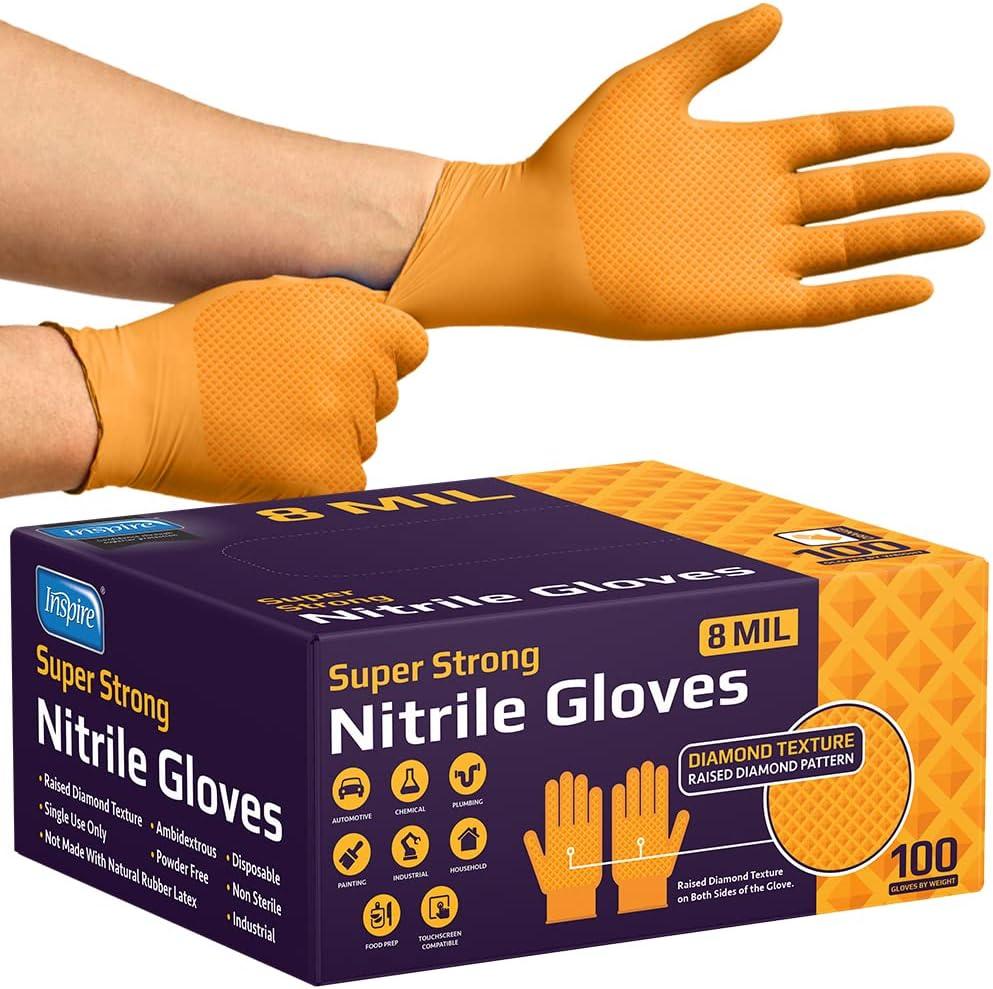 imageInspire Heavy Duty Orange Nitrile Gloves  ULTRA 8 Mil Diamond Textured Grip  Industrial Mechanic Disposable Cleaning Gloves100