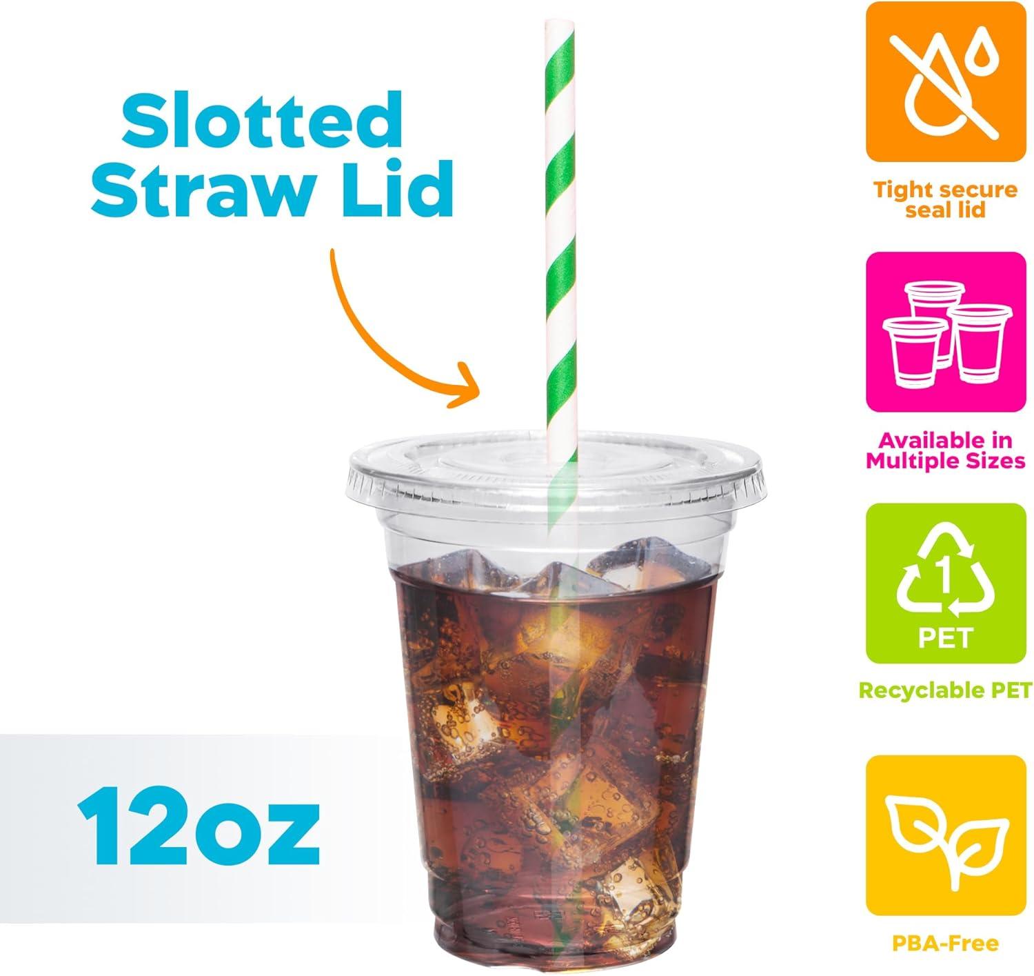 SLOTTED LID FOR STRAW: Lid is slotted to insert straw for easy drinking. Add your own straw and create the ideal smoothie cups with lids and straws or cold clear cups with lids and straw for on the go convivence. Straws sold separately.