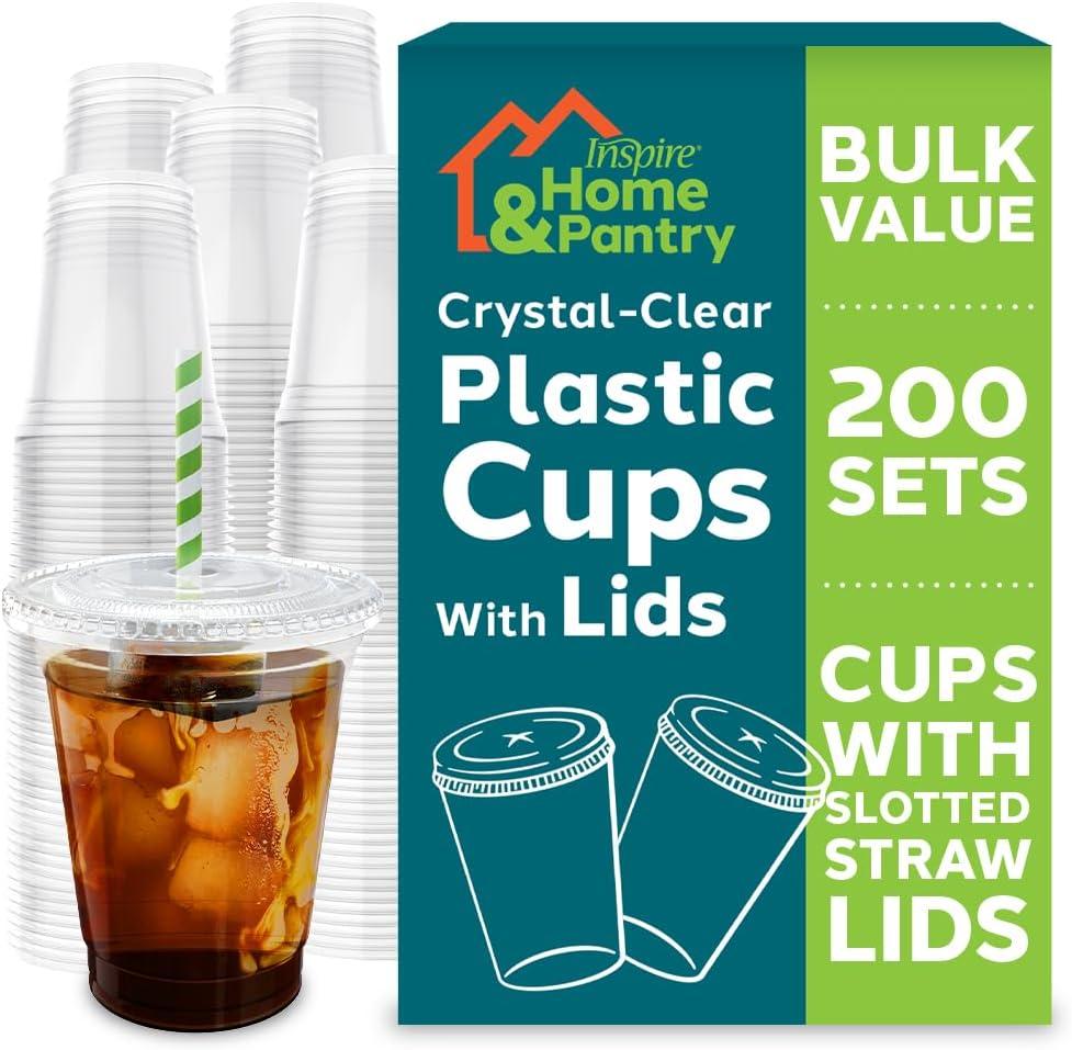Inspire Home & Pantry Plastic Cups with Lids | BULK SAVINGS Smoothie Cup, Iced Coffee, Soda | Crystal Clear | 16 Oz Case of 192(12 Oz – 200 Count)