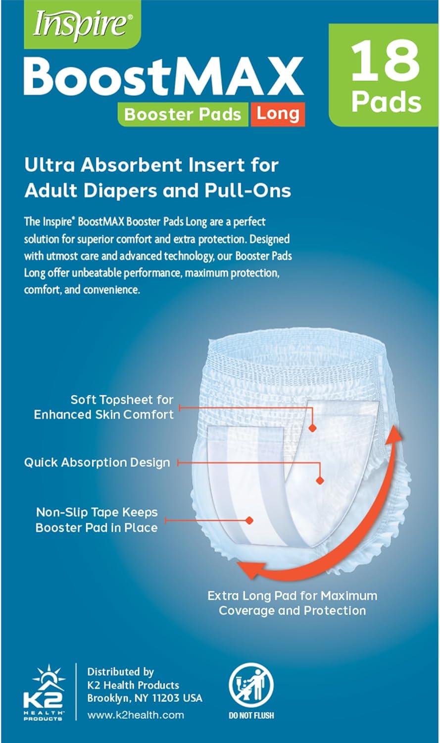 SOFT TOP SHEET FOR ENHANCED SKIN COMFORT: Managing incontinence can lead to rashes, skin break down and sores. Inspire diaper booster pads feature an extra soft top sheet for skin comfort while the absorbent core wicks away moisture quickly and efficiently. Incontinence booster pads make daily life easier and safer for caregivers and patients.